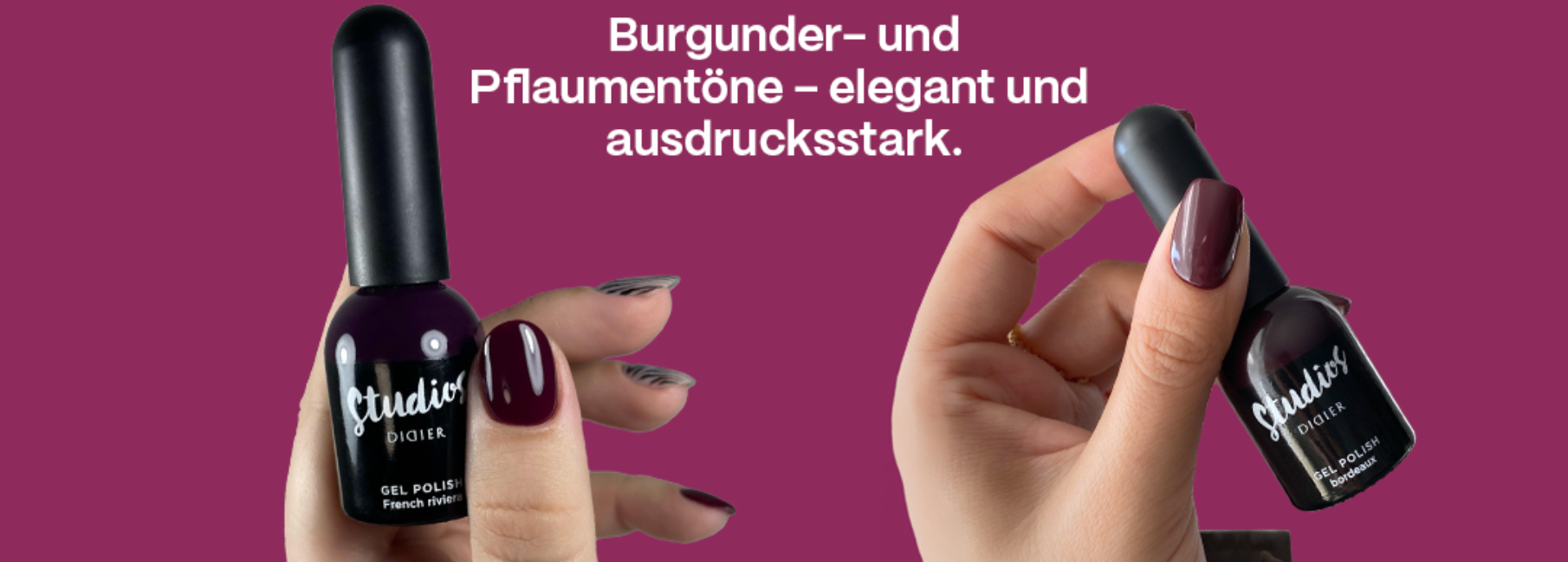 Tiefgründige Burgunder- und Pflaumentöne verkörpern wie keine andere Farbwelt Eleganz, Selbstbewusstsein und Stärke. Sie bringen eine raffinierte Tiefe auf die Nägel und sind der perfekte Begleiter für kühle Herbsttage – ob beim Spaziergang im Park oder beim Dinner am Abend.