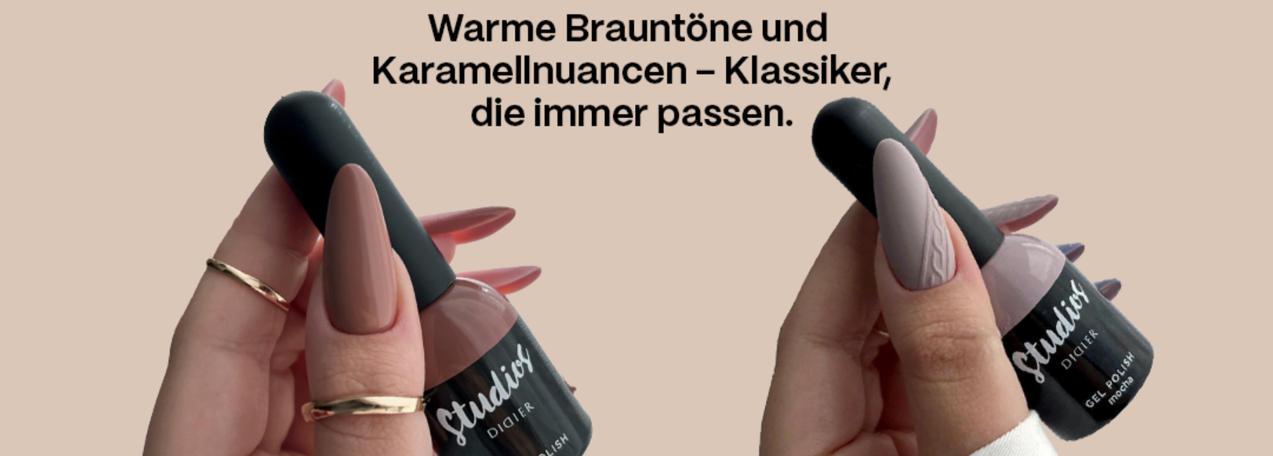 Wer es ruhiger, harmonischer und zeitlos liebt, liegt mit warmen Braun- und Karamelltönen genau richtig. Diese klassischen Herbstfarben verleihen deinen Händen eine weiche, natürliche Eleganz, ohne aufdringlich zu wirken. Besonders schön wirken sie in Kombination mit goldenen Ringen, Strickpullovern oder warmen Erdtönen im Outfit.