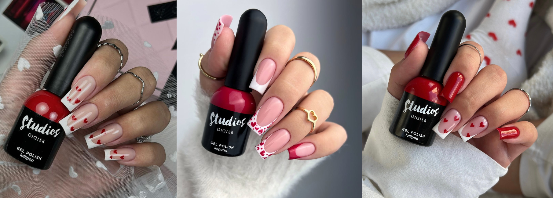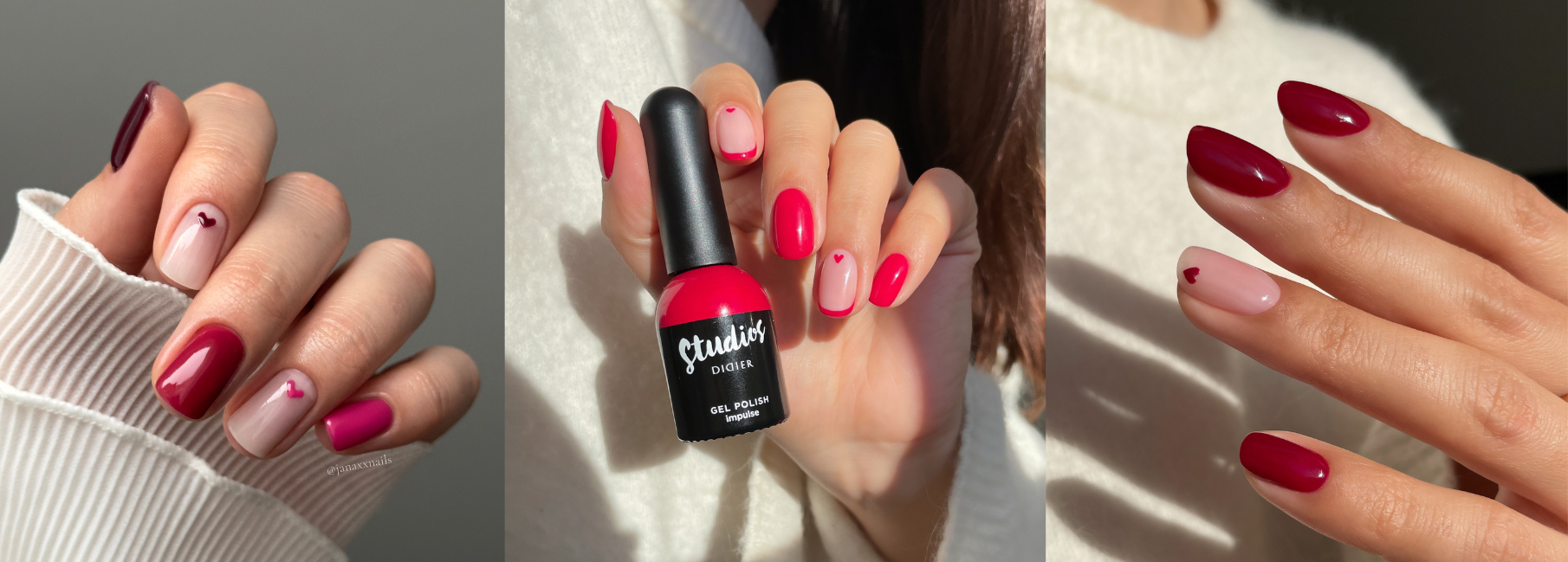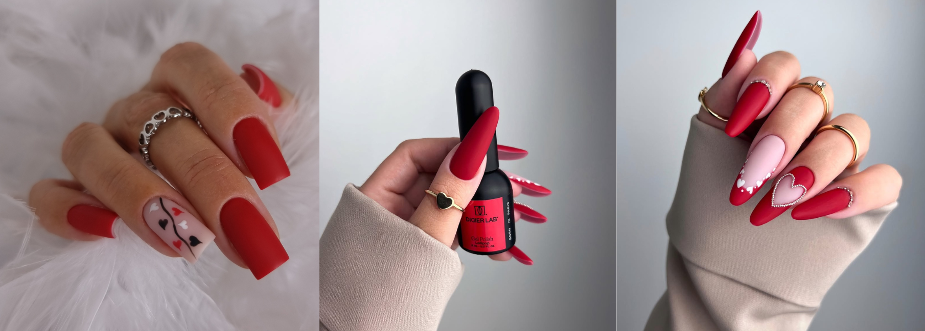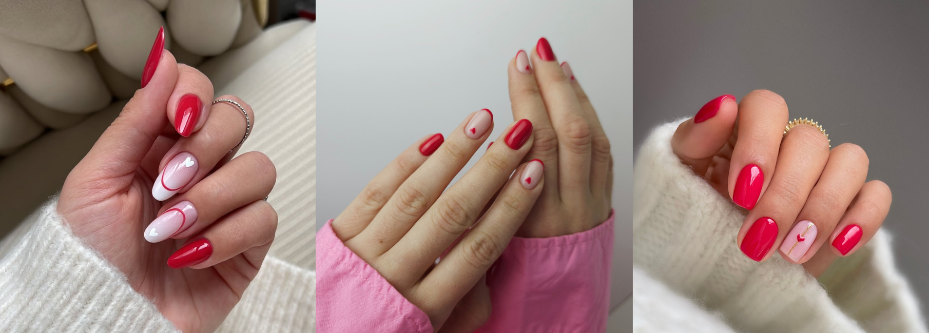 Milchiges Rosé trifft auf klares Rot. Der Kontrast zwischen einer soften Base und präzisen roten Details wie Outlines, French-Spitzen oder kleinen Herzen macht das Design modern und ausgewogen.