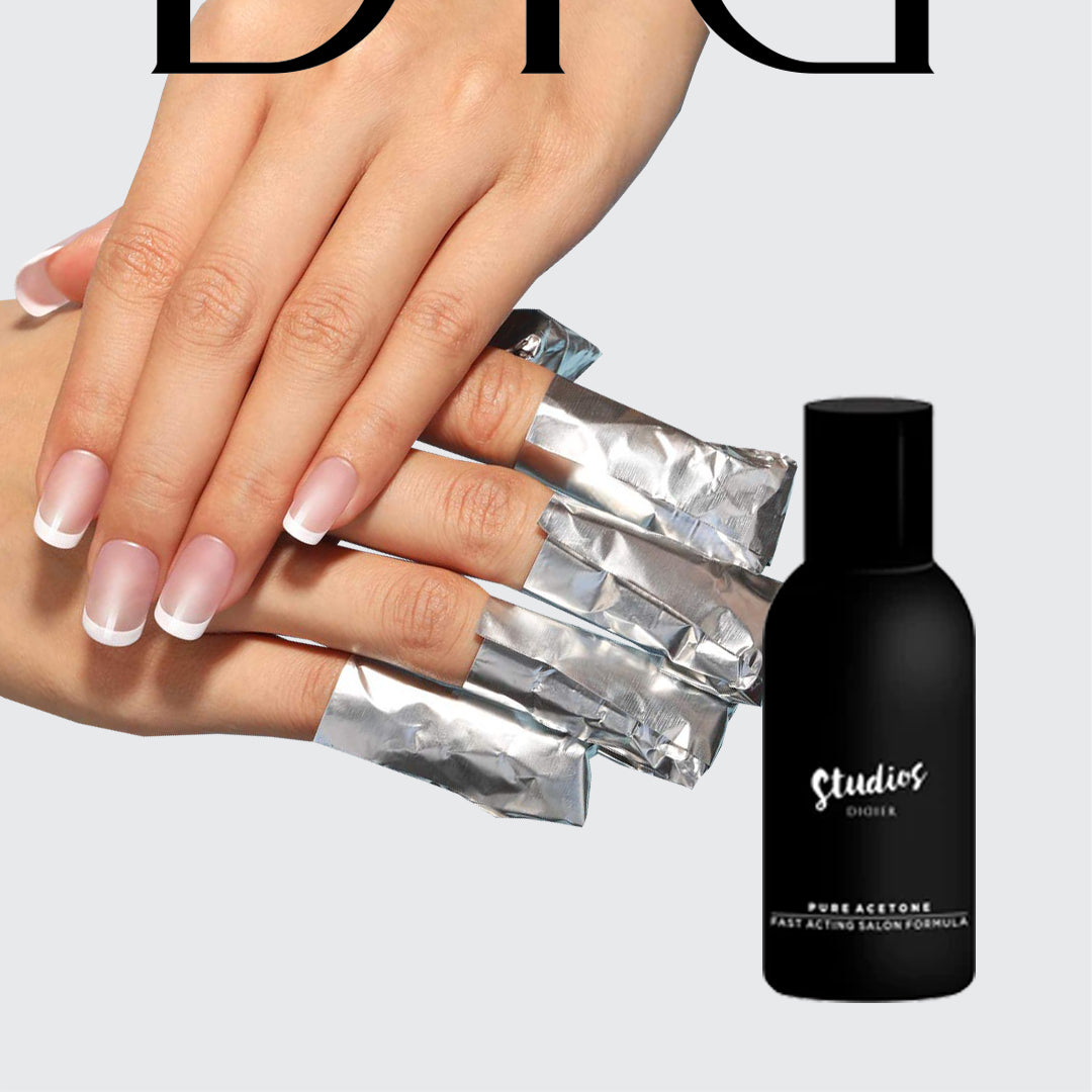 Besorge dir ein paar Wattepads, Didier Lab Nagellackentferner (acetonhaltig) und Alufolie. Stelle sicher, dass du genügend Zeit und einen gut belüfteten Raum hast.