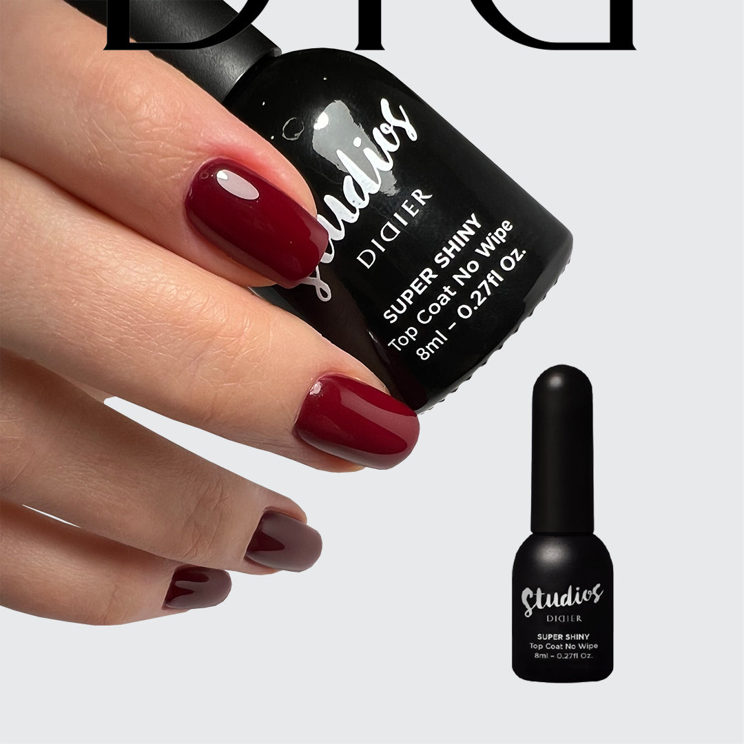 Abschließend trage eine dünne Schicht Didier Lab Top Coat auf deine UV-Nagellackschicht auf. Der Top Coat sorgt für einen langanhaltenden Glanz und schützt deine Maniküre vor Kratzern und Abrieb. Lasse den Didier Lab Top Coat unter der UV-Lampe aushärten.