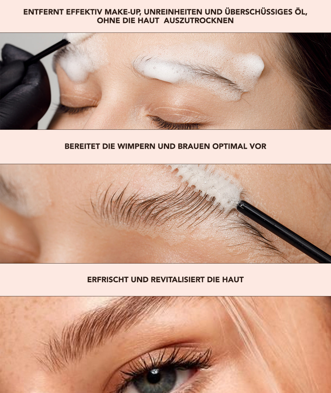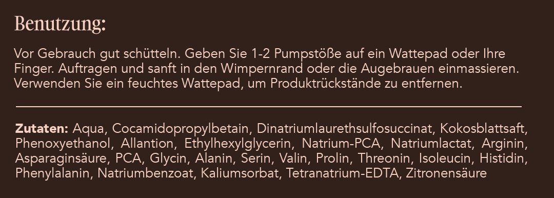 Angereichert mit natürlichen Inhaltsstoffen, pflegt unser Reinigungsschaum nicht nur, sondern versorgt deine Brauen und Wimpern auch mit Feuchtigkeit, fördert deren Gesundheit und unterstützt das natürliche Wachstum. Die leichte und luftige Textur des Schaums sorgt für eine angenehme Anwendung und hinterlässt ein frisches, sauberes Gefühl ohne Rückstände.