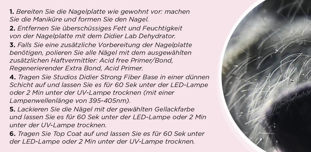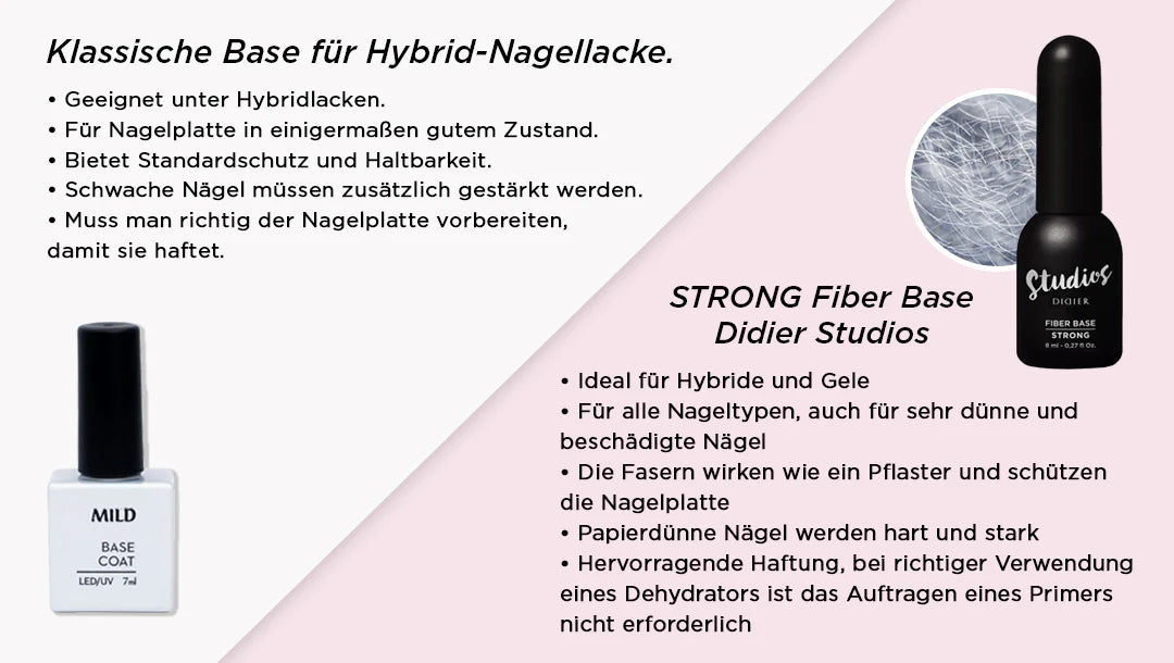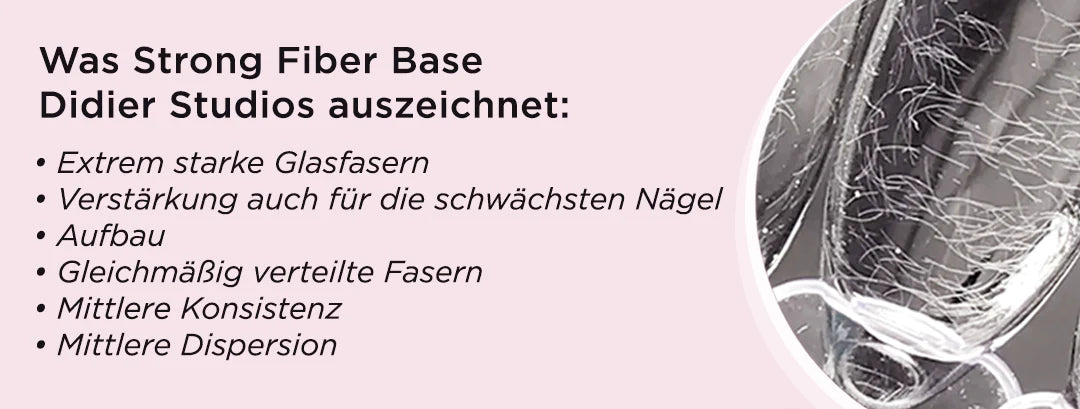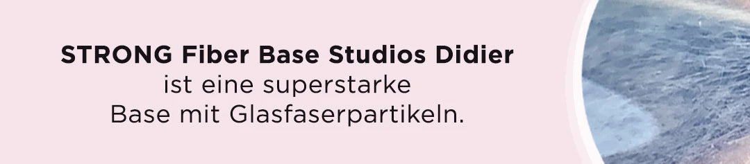 Strong Fiber Base Studios Didier mit synthetischen Glasfaserpartikeln ist eine außergewöhnlich starke und haltbare Base. Sie enthält unsichtbare Glasfaserpartikel, die als sichere Verbindung zwischen dem natürlichen Nagel und dem Nagellack wirken.