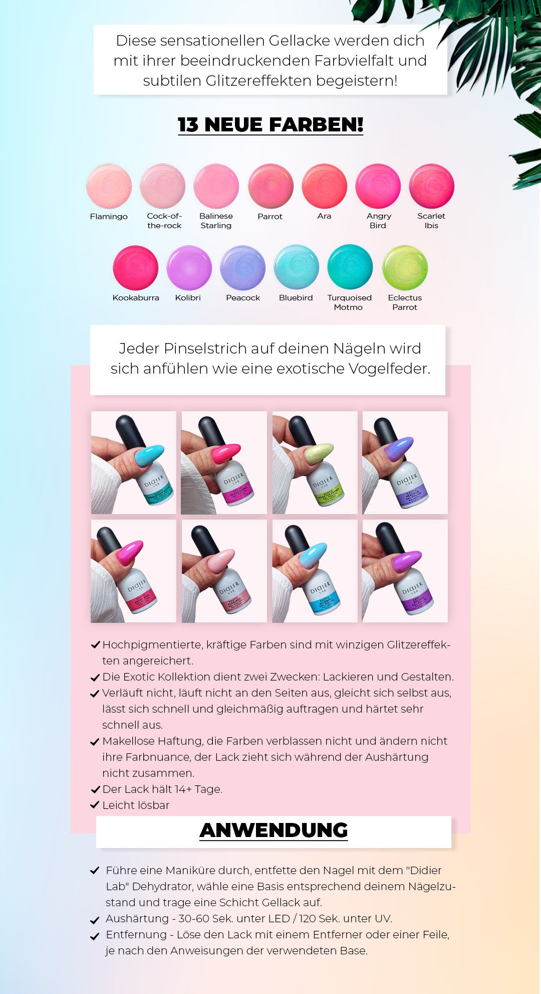 Hochpigmentierte Gellacke in exotischen Farben, die für eine vollständige Nagelabdeckung und verschiedene Design-Optionen verwendet werden können.