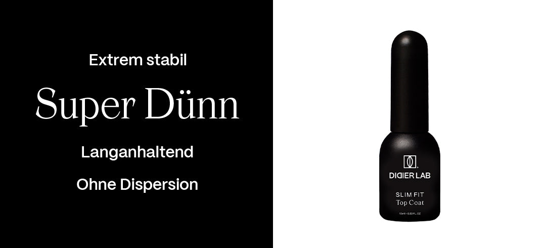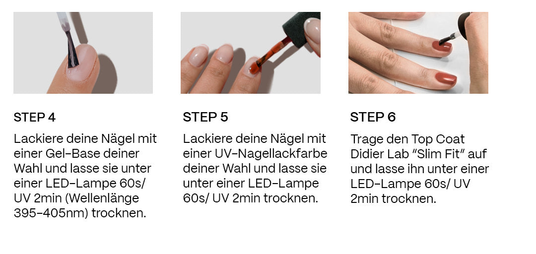 - Top Coat auftragen: Den Didier Lab Slim Fit Top Coat auftragen und unter einer LED-Lampe für 60 Sekunden oder einer UV-Lampe für 2 Minuten aushärten.