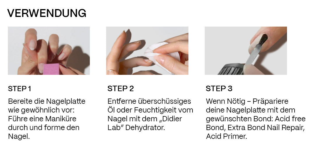 - Optional: Falls erforderlich, die Nagelplatte zusätzlich mit einem Haftvermittler wie Acid-Free Bond, Extra Bond Nail Repair oder Acid Primer behandeln.