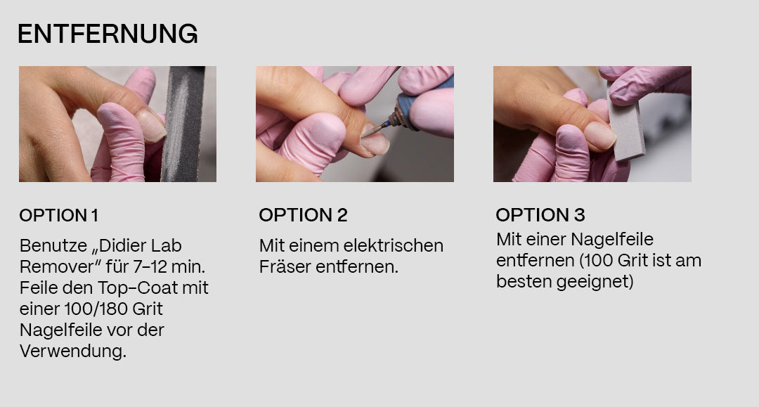 - Die Nägel 7–12 Minuten lang mit Didier Lab Remover einweichen.