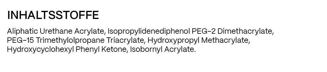 Aliphatic Urethane Acrylate, Isopropylidenediphenol PEG-2 Dimethacrylate, PEG-15 Trimethylolpropane Triacrylate, Hydroxypropyl Methacrylate, Hydroxycyclohexyl Phenyl Ketone, Isobornyl Acrylate.