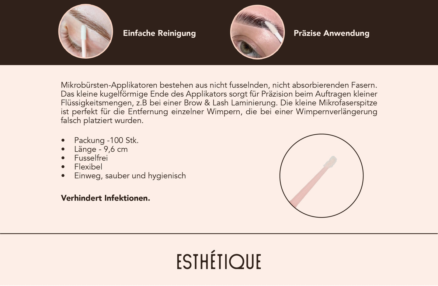 Mikrobürsten-Applikatoren bestehen aus nicht fusselnden, nicht absorbierenden Fasern. Das kleine kugelförmige Ende des Applikators sorgt für Präzision beim Auftragen kleiner Flüssigkeitsmengen, z.B bei einer Brow & Lash Laminierung. Die kleine Mikrofaserspitze ist perfekt für die Entfernung einzelner Wimpern, die bei einer Wimpernverlängerung falsch platziert wurden.