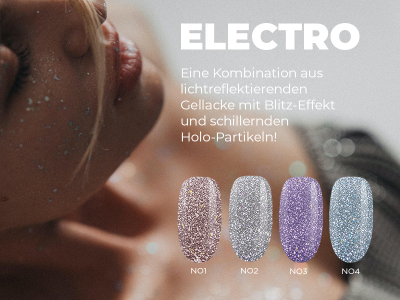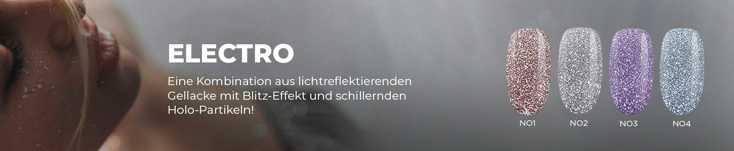 Willkommen in unserer aufregenden Welt der ELECTRO Kollektion - unserer neuesten Innovation in Sachen UV-Nagellacke. Diese Kollektion wurde speziell für dich entwickelt, um deine Nägel in ein funkelndes Meisterwerk zu verwandeln. Mit glitzernden Partikeln und dreidimensionalen holografischen Effekten verleiht ELECTRO dir einen Look, der alle Blicke auf sich zieht.