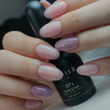 Gellack POP STAR No1 hat einen sanften Rosaton mit holografischen Glitzerpartikeln. Dieser Hybridlack vereint Eleganz und Glamour auf einzigartige Weise.