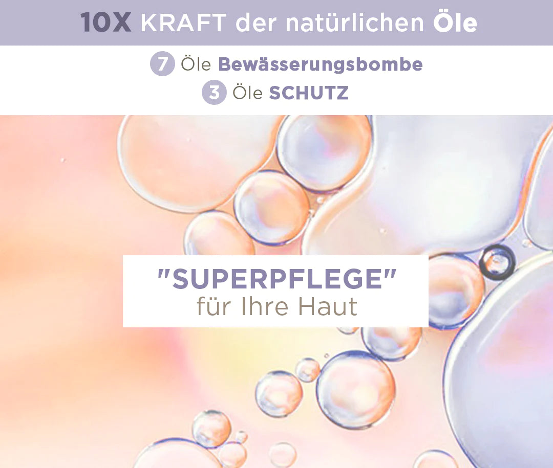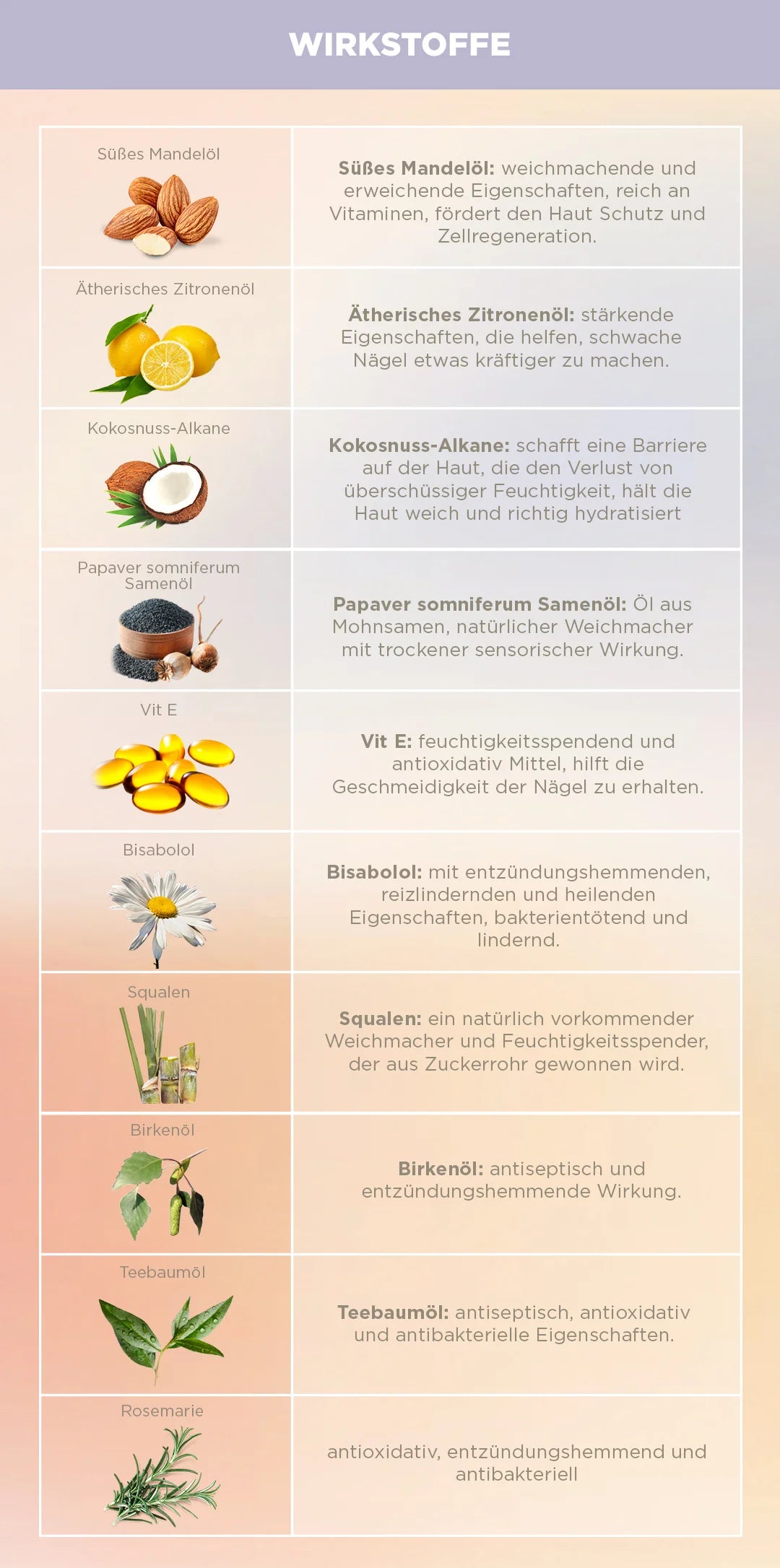 Inhaltsstoffe: Hydriertes Farnesen, Prunus amygdalus dulcis Öl, Caprylic/Capric Triglyceride, Papaver somniferum Samenöl, Squalan, Kokosnussalkane, Helianthus annuus Samenöl, Bisabolol, Melaleuca alternifolia Blattöl, Cym bopogon Flexuosus Öl, Lialcoferol, Zitronensäure Betula Alba Blattextrakt, Linalool, Rosmarinus Officinalis Blattextrakt.
