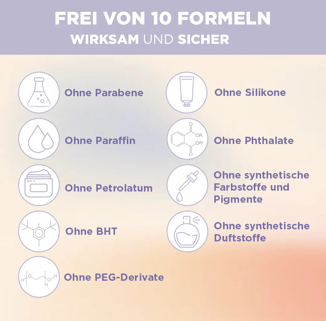 FORMELIERT OHNE: Parabene, Paraffin, Petrolatum, BHT, Silikone, PEG-Derivate, Phthalate, synthetische Farbstoffe und Pigmente, synthetische Duftstoffe.