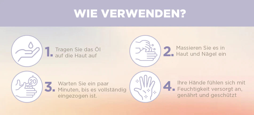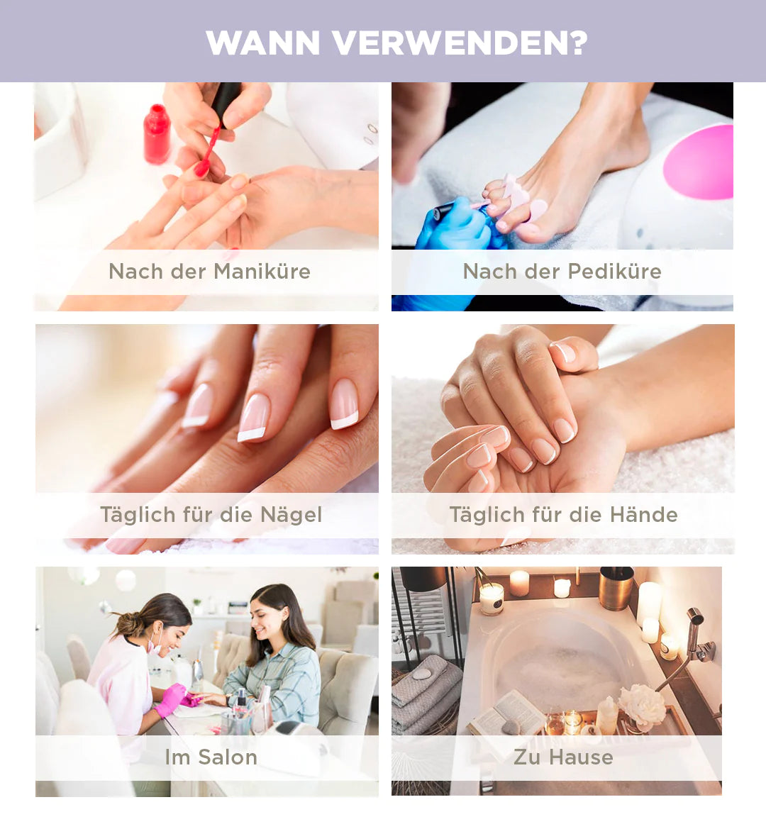 Anwendung: Tragen Sie es auf Nägel und Hände auf. Massieren, bis es eingezogen ist. Tipp: Ein Tropfen dieses einzigartigen Öls kann auch in die Handcreme gegeben werden, um eine besonders intensive Behandlung zu erzielen.