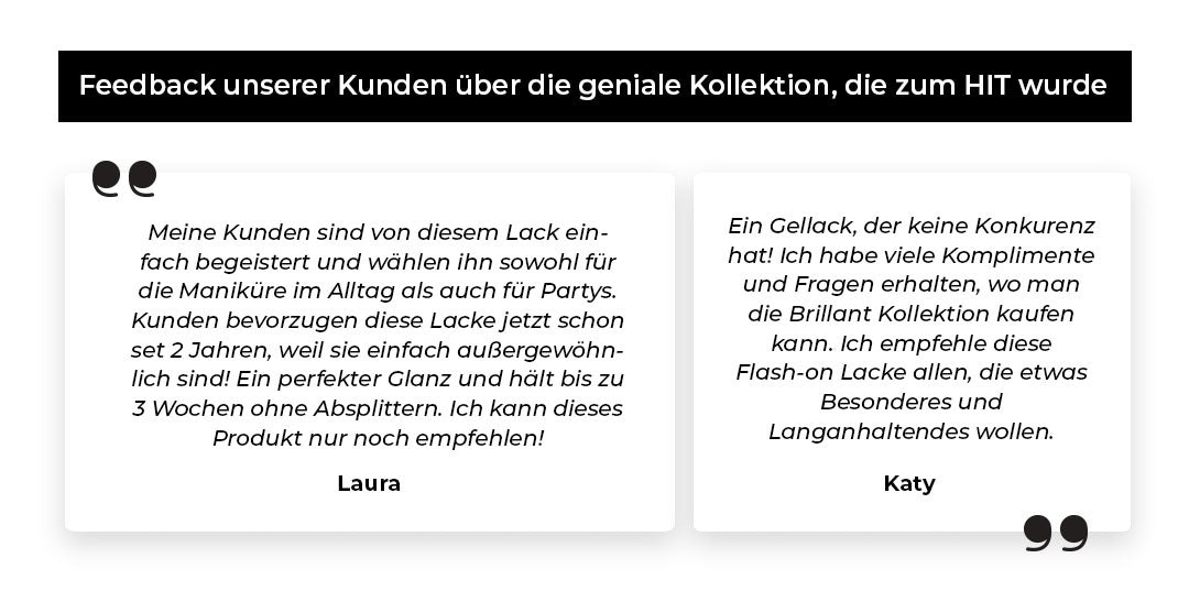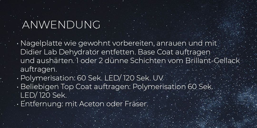 Die Brillant-Kollektion besteht aus Millionen Partikeln, die in einer eleganten Flasche eingeschlossen sind. Tausende von lichtreflektierenden Partikeln lassen Deine Nägel aus der Ferne wie Diamanten glänzen!