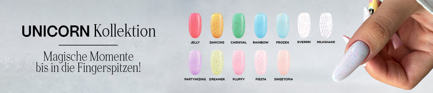 Tauche ein in die zauberhafte Welt unserer Unicorn Kollektion - eine Kollektion von Gellacken, die speziell für Meister entwickelt wurden. Diese Gellacke bieten eine leicht zu verarbeitende und perfekt deckende Textur, die es ermöglicht, schnell und einfach interessante und einzigartige Nageldesigns zu erstellen. Die kleinen, unvorhersehbaren Partikel in diesen Lacken bringen Abwechslung in deine Arbeit und eröffnen unzählige Möglichkeiten für kreative Designs.