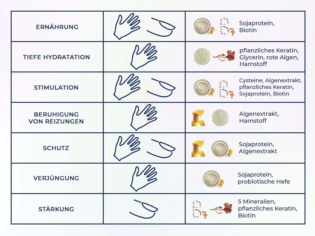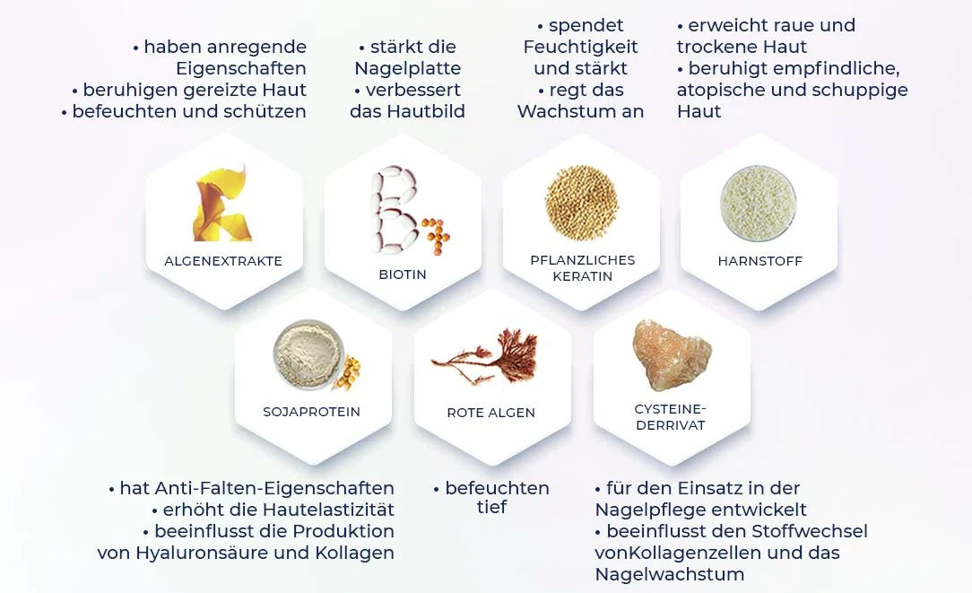 • Cystin-Derivat: speziell für den Einsatz in der Nagelpflege entwickelt. Auswirkungen auf die Energie Stoffwechsel der Keratinzellen und Nagelwachstum.