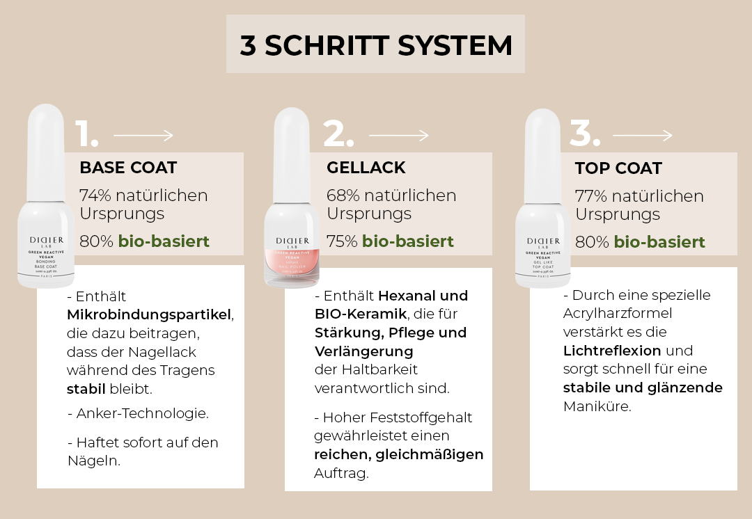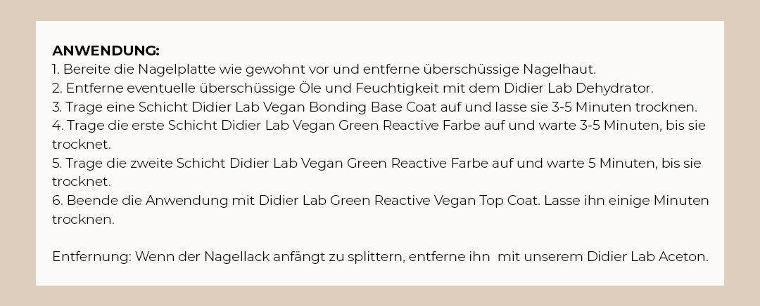 - Beende die Anwendung mit eine dünne Schicht Didier Lab Green Reactive Vegan Top Coat. Lasse ihn einige Minuten trocknen.