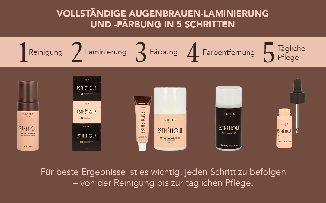 Wenn zuvor Didier Lab Esthetique Brow Lamination Produkte verwendet wurden, verkürzt sich die Einwirkzeit auf 2 Minuten.